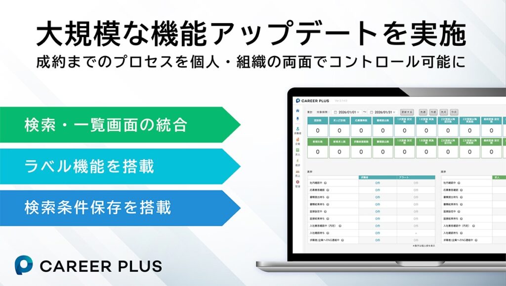 株式会社じげん(本社:東京都港区、代表取締役 社長執行役員CEO:平尾丈、東証プライム:3679、以下じげん)のグループ会社で、人材紹介会社向け業務基盤システム「CAREER PLUS(キャリアプラス)」(サービスサイト:https://careerplus-info.com/)を開発・提供する株式会社ブレイン・ラボ(本社:東京都港区、代表取締役:中江典博)は、情報の「可視化」と「共有」を軸とした大規模な機能アップデートを実施いたしました。