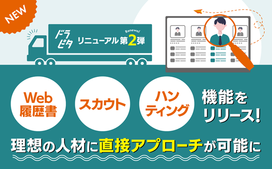 Dorapita (https://www.dorapita.com/), a job-listing website specializing in the transportation and logistics industry operated by Awesome Agent Co., Ltd. (Headquarters: Izumi, Higashi-ku, Nagoya City, Aichi; Representative Director: Haruhisa Daita, hereinafter referred to as Awesome Agent), a group company of ZIGExN (Headquarters: Minato-ku, Tokyo; Representative Director, Operating Officer, and CEO: Joe Hirao; Tokyo Stock Exchange Prime: 3679, hereinafter referred to as ZIGExN), has launched the new “Web Resume,” “Scouting,” and “Hunting” features, which became available in July 2025.