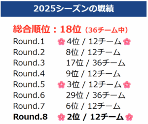 じげんアップデーターズは国内最高峰の3×3グローバルプロリーグ「3×3.EXE PREMIER」に、チーム創設の2022年以来継続して参戦しています。4年目となる今シーズンは、各ラウンドで精力的に試合を行い、Round.1 から Round.8 までの合計成績は 9勝11敗 となりました。最終順位は36チーム中18位。惜しくもプレーオフ進出は叶いませんでしたが、最終Round.8ではチームのPREMIER史上 最高順位である 2位・準優勝となり、昨シーズンより大きな成長を遂げることができました。