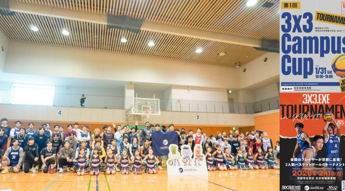 初日は西日本の学生を対象とした「3×3 Campus Cup supported by 3×3.EXE TOURNAMENT(以下、3×3キャンパスカップ)」、2日目はプロ・一般・学生が競う「3×3.EXE TOURNAMENT 2025-2026 KYOTO presented by ZIGExN UPDATERS.EXE(以下、EXEトーナメント)」を実施。
